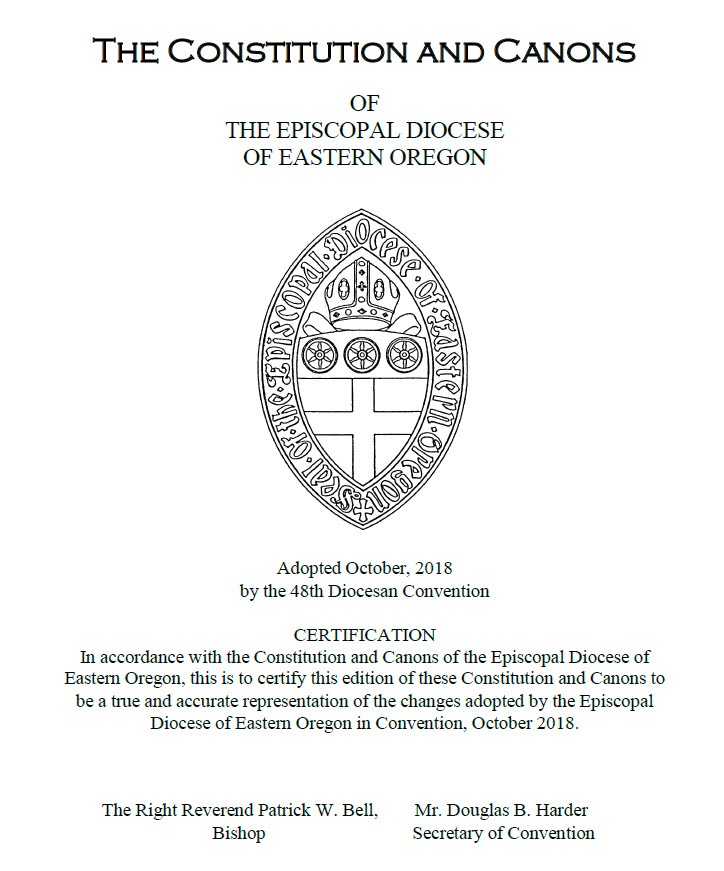 First adopted in October 1992 and last amended at the 2018 Diocesan Convention, the canons specify the governance and procedures of the diocese. The constitution comprises the Articles of Incorporation of the diocese as a non-profit corporation. The entire document containing both Constitution and Canons is 33 pages long.